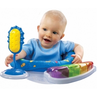 Комплекс представляет собой мини-манеж, в котором ваш ребенок чувствует себя настоящим ди-джеем! Малыш помещается в тканевое сиденье-трусики и его окружает потрясающий круглый столик, на котором расположены различные музыкальные игрушки: разноцветное пианино (с большими удобными для ручек малыша кнопками), говорящий дискобол (этот блестящий шар можно крутить, а так же нажимать-заиграет музыка), устройство, имитирующее пульт диджея (на этой зелёной панельке есть: а) диск-можно крутить, либо потянуть за рычаг, чтобы его раскрутить; б) рычаг-трещеточка (тягая вверх-вниз, малыш услышит звук трещётки; в)крышечка (её можно открывать и закрывать), и большой ди-джейский микрофон, которой можно потягать и поталкать. Так, на столике находится волшебная музыкальная книжка, переворачивая страницы которой, ребенок выбирает различные режимы игры: режим обучения и режим музыки. Сиденье поворачивается на 360 градусов и позволяет ребенку иметь свободный доступ ко всем игрушкам. Центр может быть установлен стабильно или так, чтобы слегка покачиваться. Регулируется по высоте: 3 уровня. Диаметр комплекса 70см .